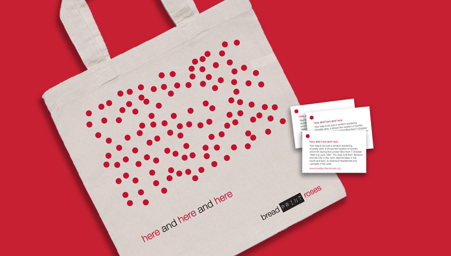 The bag illustrates the location of the bombs which fell on an area of London during the blitz.